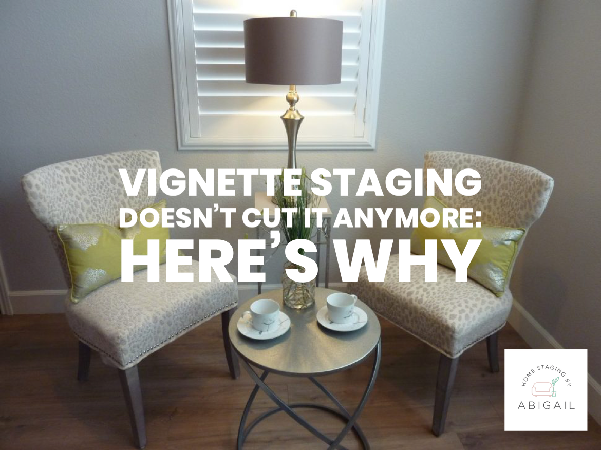 Vignette staging is where small groupings of furniture and décor are used for adding some visual appeal and in helping to define the purpose and size of a room. It was a technique widely used at the time. But in today’s staging world, vignette staging does not work.